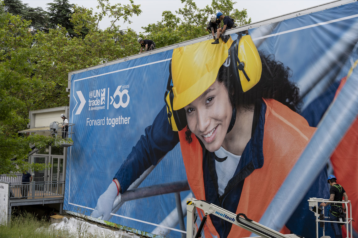 For UNCTAD’s 60th anniversary at the Palais des Nations, I developed a dynamic branding system spanning venue design, digital assets, and communications. The colorful identity seamlessly integrated into the historic setting, from large-scale banners to media backdrops and stage design.
